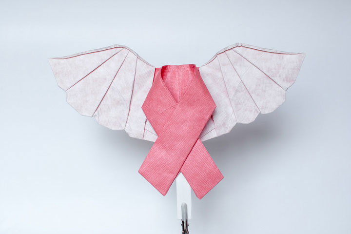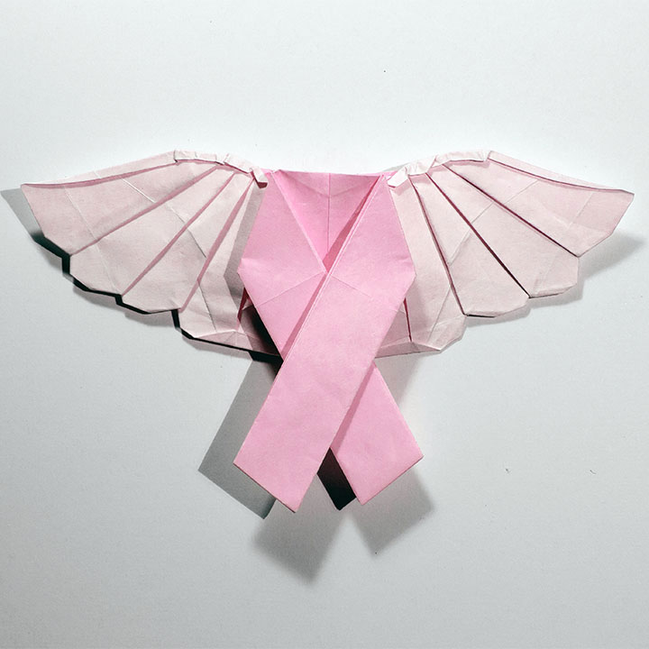 Since this is a model that I want many people to be able to fold, I intentionally made this new version less complex than the first version so that it is accessible to more folders. I excluded the halo for simplicity. This model can be folded by starting from a bird base. Choose different paper colors to represent other awareness causes. Shown below is a pink breast cancer version.
