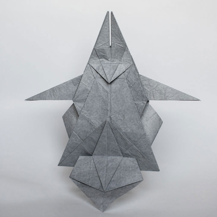 I redesigned my previous big Totoro (Big Totoro v1) model. I thought my previous version didn't look like Totoro enough, so I tried to remedy that with this new version. The most significant change is in the head. The new ear structure that I came up with dictated the design of this model's face. The ears are longer and easier to shape. The eyes have centered pupils and are spaced farther apart. I eliminated the excess paper that formed the leaf hat in the previous version and added more paper flaps in the chest area to represent the arrow markings on Totoro's chest. Finally, I partially recycled the tail design from the v1 model, but with some modifications.