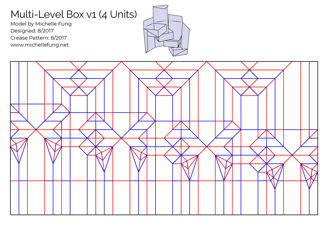This box is flat-foldable, and the box units in this model can be tessellated. My folds only used four box units, but theoretically, an infinite number of boxes can be tiled vertically and horizontally. My first idea while designing this model wasn't very efficient - this version is 30% more efficient than my initial idea.