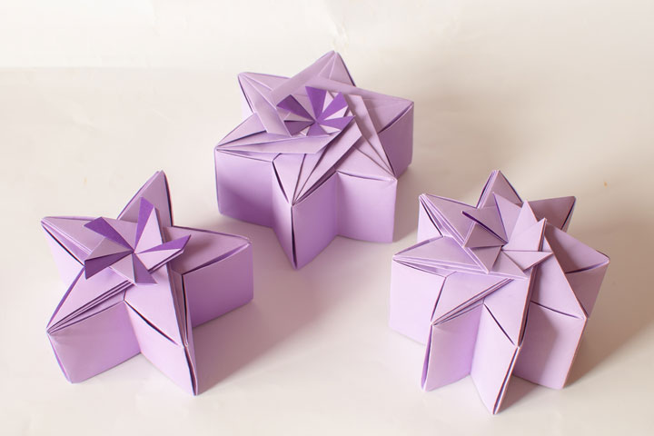 More variations with different point counts and spacing are possible. The twist fold pleats narrow as the point count increases or the point spacing decreases. The ones I tried have fewer points and are thus quicker to fold. When folding this model, avoid unnecessary creases as much as possible - especially on the bottom, since extraneous creases weaken the rigidity of the box. A clean twist fold collapse is also ideal.